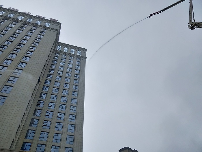 6月22日上午9時(shí)30分,四化大廈9樓濃煙滾滾,樓內(nèi)警鈴大作,員工們手拿濕毛巾,捂住口鼻從樓內(nèi)消防通道快速有序的撒離疏散到安全地帶,工作人員不時(shí)提醒疏散人員清點(diǎn)人數(shù),報(bào)告?zhèn)銮闆r和穩(wěn)定情緒。不到兩分鐘時(shí)間,兩臺(tái)消防車(chē)風(fēng)馳電掣的駛?cè)氪髲B院內(nèi),全副武裝的消防隊(duì)員快速啟動(dòng)消防裝備,分兩路進(jìn)行救援和滅火。不一會(huì)兒,樓內(nèi)滅火隊(duì)員和消防云梯車(chē)幾乎同時(shí)噴出水柱直達(dá)20樓頂。