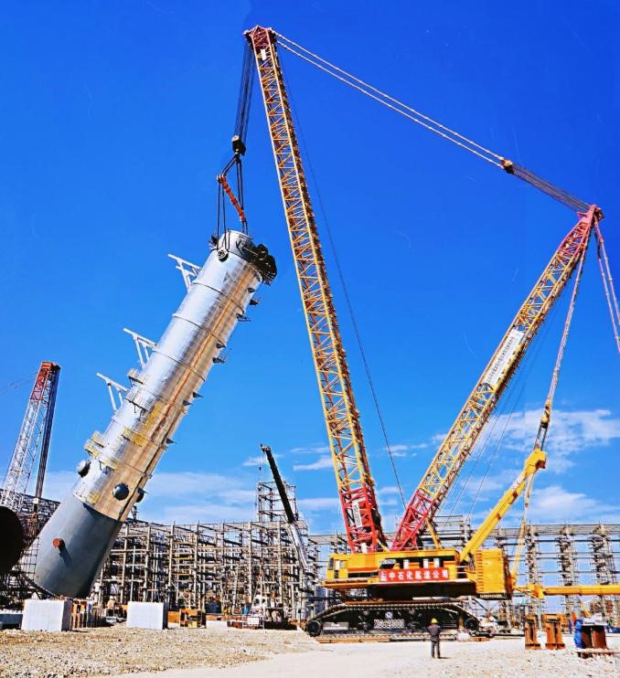 自今年9月20日以來(lái), 苯乙烯項(xiàng)目部共成功吊裝第一脫氫換熱器、三聯(lián)換熱器、轉(zhuǎn)烷基化反應(yīng)器、苯處理器、多乙苯塔、苯/甲苯塔等大型設(shè)備13臺(tái),吊裝總噸位約達(dá)2000噸。其中,最重設(shè)備三聯(lián)換熱器重687噸,高41米,最大吊裝高度63米;而這次吊裝的低壓粗苯乙烯塔,塔體總高度92.2米,重量950噸,是整個(gè)大型設(shè)備吊裝中最復(fù)雜的設(shè)備之一,分兩段運(yùn)至施工現(xiàn)場(chǎng),由2000噸吊車(chē)吊起來(lái)空中組對(duì)、焊接。