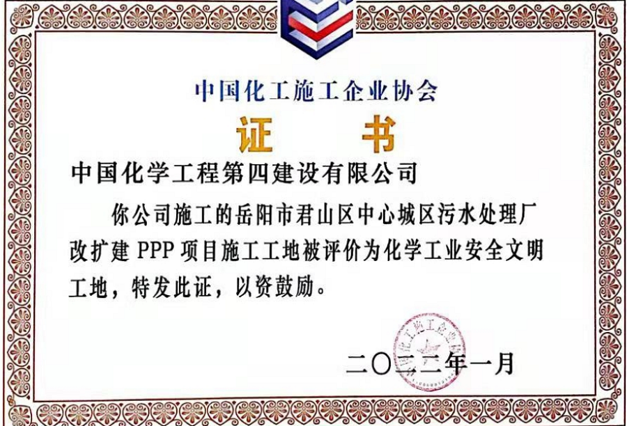 近日,從中國化工施工企業(yè)協(xié)會傳來喜訊,由市政工程公司承建的岳陽市君山區(qū)中心城區(qū)污水處理廠改擴(kuò)建PPP項(xiàng)目被評為“化學(xué)工業(yè)安全文明工地”稱號。