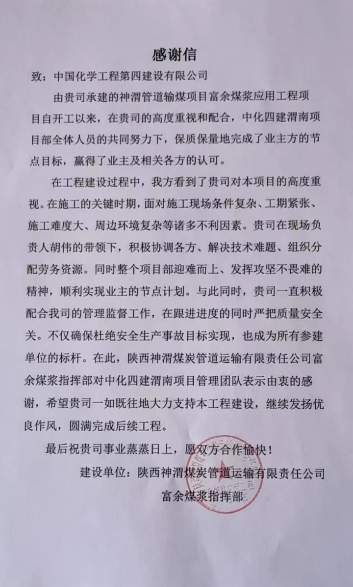 1月5日,中化勞務(wù)公司收到陜西神渭煤炭管道運(yùn)輸有限責(zé)任公司富余煤漿指揮部發(fā)來的感謝信,對(duì)中化勞務(wù)承建的神渭管道輸煤項(xiàng)目富余煤漿應(yīng)用工程項(xiàng)目保質(zhì)保量完成節(jié)點(diǎn)目標(biāo),贏得業(yè)主及相關(guān)各方的認(rèn)可,表示感謝。