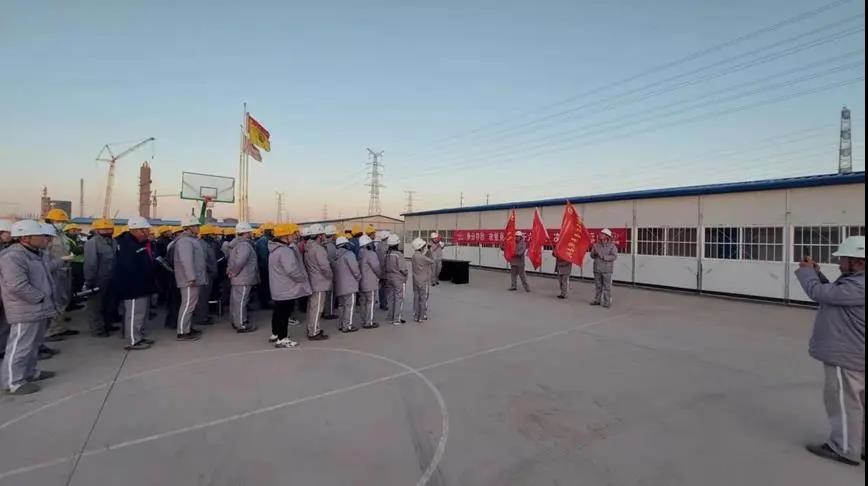 11月27日,東北分公司滄州旭陽(yáng)項(xiàng)目部在項(xiàng)目現(xiàn)場(chǎng)舉行“青年突擊隊(duì)”授旗儀式。項(xiàng)目負(fù)責(zé)人鮑磊為鋼結(jié)構(gòu)安裝、設(shè)備安裝及管道安裝三支突擊隊(duì)授旗。