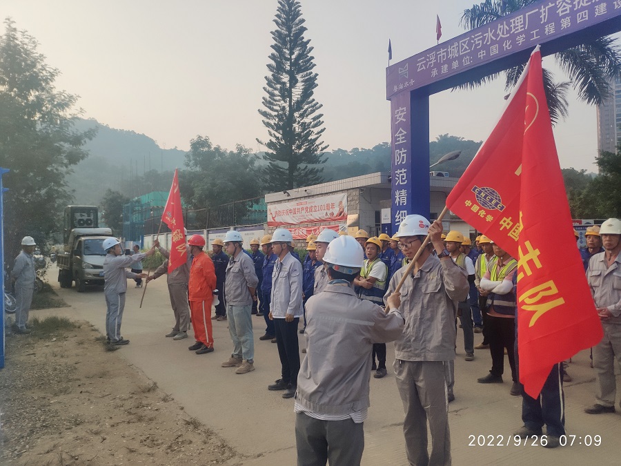 9 月 26日,華南公司粵海(云?。┏菂^(qū)污水項目部召開“百日會戰(zhàn)”動員部署會,并現(xiàn)場授旗,迅速掀起大干搶工熱潮。