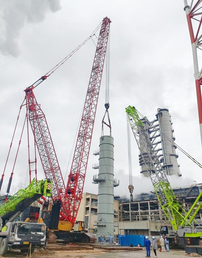該設(shè)備重量為120.6噸、筒體直徑4.6米、高28.29米,是項(xiàng)目的核心設(shè)備,屬大型吊裝作業(yè)。為確保安全順利完成吊裝,項(xiàng)目部編制了專(zhuān)項(xiàng)施工方案和措施,對(duì)現(xiàn)場(chǎng)全體施工人員進(jìn)行了安全技術(shù)交底。在吊裝過(guò)程中,項(xiàng)目施工一線(xiàn)人員嚴(yán)格按照方案施工,努力克服吊裝工作場(chǎng)地狹小、工序多、技術(shù)要求高的不利影響,緊密協(xié)作、共同努力,整個(gè)吊裝過(guò)程有條不紊,實(shí)現(xiàn)了一次吊裝成功。